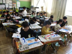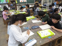 1年2組の図工は、新1年生に行事や学習、生活の様子を伝える絵を描いていました。