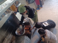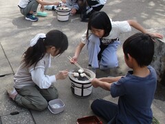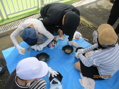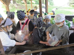今日は実際に洗濯板を使って洗濯したり、七輪を使ってお餅を焼いたりしながら、昔のくらしの一端を体験しました。