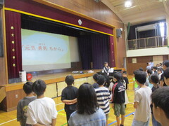 今日の集会は各委員会の委員長の紹介です。各委員長からはそれぞれの委員会の仕事内容、児童にお願いしたいことの話がありました。学校の生活をよりよくするために委員会活動にすすんで取り組む姿が見られることを期待しています。