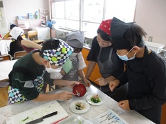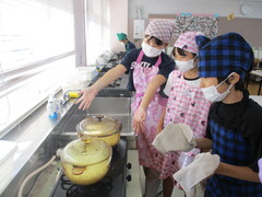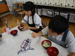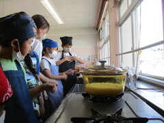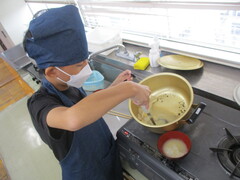5年2組の調理実習の様子です。班のみんなで役割を分担して「青菜のおひたし」を作りました。作った後は、おいしくいただきました。