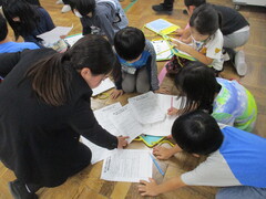 今日の朝の時間はチーム集会でした。1年生から6年生までの数人ずつでチームを作り、異学年交流を行っています。