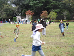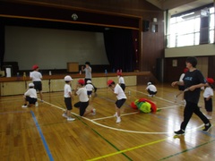 クラスごとのお題を先頭のこどもたちが覚えて、順番に伝言していきました。