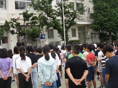 全校朝会で東京都公立学校美術展覧会に出品した児童の紹介と表彰(代表1名)を行いました。