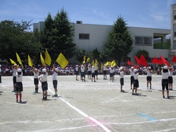 3年生、運動会の表現の練習です。黄色と赤色のフラッグを使って表現していきます。