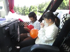 1組のバスレクです。風船についているテープを剥がすゲームです。