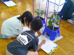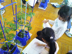 2年生は生活科「大きくそだてわたしの野さい」の学習を行いました。「ナス・ピーマン・ミニトマト・シシトウ・オクラ」の中から自分で育てたい野菜を決めて、育てています。5月14日(水曜)には、自分の野菜と友達の野菜の成長の様子を比べて、同じところや違うところを伝えました。「早く収穫したい。」「もっと大きくなってほしい。」と気持ちを高めました。