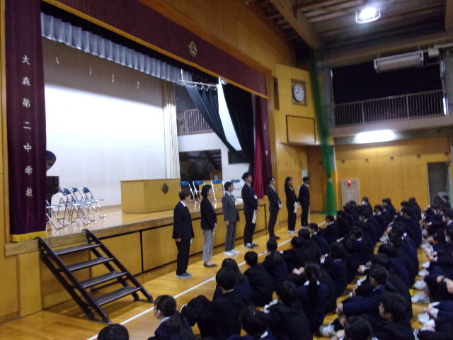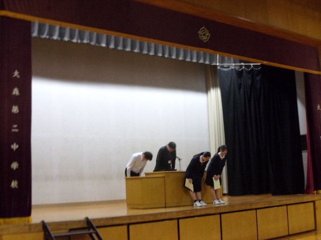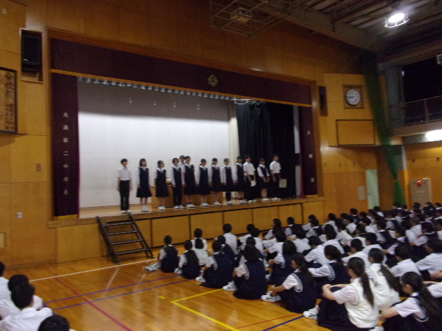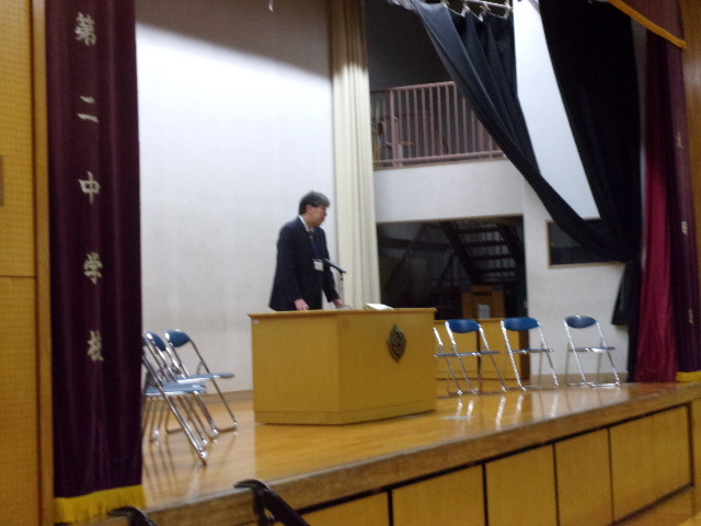 その後始業式をはさんで、お待ちかねの担任発表がありました。学校によっては、この発表がとても盛り上がる(?)ところもあるのですが、本校のばあい、生徒の反応はとっても控え目。この行儀のよさこそが二中の伝統でありよさなのでしょう。