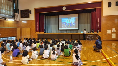 2校時、1年生は体育館で健康教育の第一歩、歯の健康について、歯科校医の先生から教えていただきました。歯のアニメDVDを視聴しながら、校医の先生が解説をしてくださる学習でした。