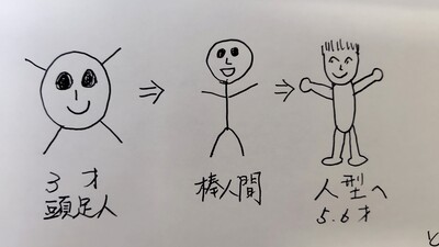 幼児が描く絵にも心の発達が見られる。3歳児が描く絵は「頭足人」といって、顔だけがよく描けていて、体がなく、手足も棒のような絵。これは3歳児にとっては顔ばかりが見えているからだ。発達していくことで、描く絵も棒人間になり、さらに全身の人型をイメージする絵になっていく。