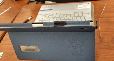 この端末、旧端末で落下による故障が多くあったため、写真のようなカバーがついており、さらにはネックストラップで首にかけた状態で持ち歩くことになっています。また、画面とキーボードを取り外せるようになりましたので、使い勝手が良くなります。