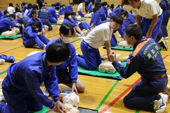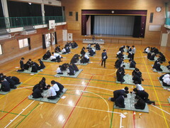 災害発生時、まず自分の命を守り、次に身近な人を助け、さらに避難所の運営など地域に貢献できる人材 を育てる防災教育に基づき、 災害発生時において、「中学生として出来ること」への対応力を養い、防災における「自助」「公助」の身構え、心構えを持たせることを目的に3年生が学校防災学習を実施しました。