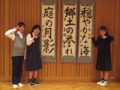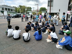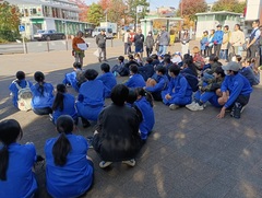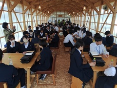 15時30分 グループ別に気仙沼市内の見学 Aグループは気仙沼市立新月中学校を訪問し、交流会を行いました。それぞれの学校の特徴を紹介したあと、グループ別に懇談した後、話した内容を全体で共有しました。閉会では六中は「六中平和の歌」を合唱し、新月中学校は校歌を斉唱しました。最後に六中から、六中の活動をまとめたポスターを新月中学校にプレゼントしました。新月中学校の熱烈な歓迎に改めてお礼申し上げます。