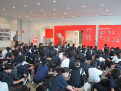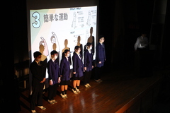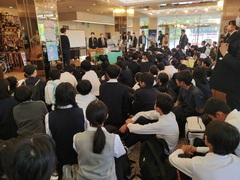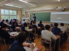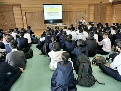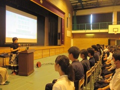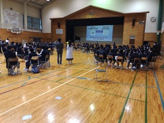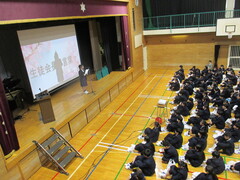 5時間目は各クラスにおいて、生命尊重に関わる道徳の公開授業を行いました。6時間目は体育館において、助産師雑賀明美さんを講師に迎え、3人の娘さんを育てたご自身の経験も踏まえて「命」についてのお話を伺いました。「三億個の精子が協力かつ競争しながら卵子を目指し、たった一つが卵子に到達する」「地球上に命が生まれて38億年、一人ひとりが38億年分の『いのち』を繋げる人である」「一つしかない命、一度きりの人生を大切に」「幸せはいつも自分が決める」さらに「生まれたときの話を聞きましょう」「命のバトンを渡す準備をしましょう」「ライフプランをデザインしましょう」「たくさんの人と出会いましょう」との呼びかけもありました。