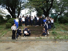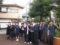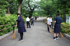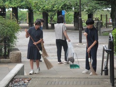1100学級、2100学級、3100学級のボランティア生徒が午前7時40分に校門前に集合し、午前8時まで洗足池公園を清掃しました。