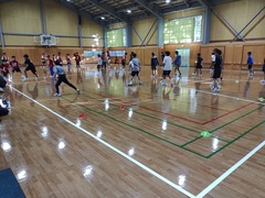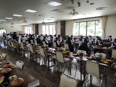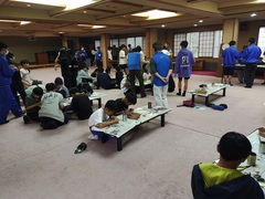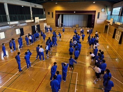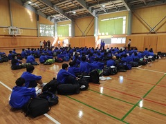 17時に宿舎の菅平高原ホテル柄澤に到着、17時15分に体育館で開校式を行いました。