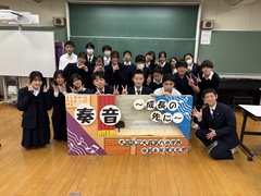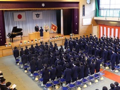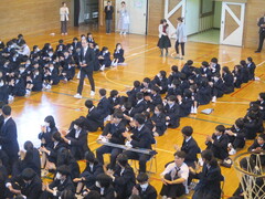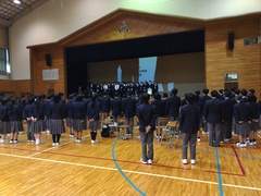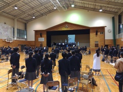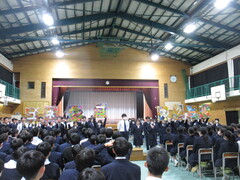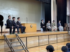3月に5人の先生方が異動されました。そのうち、2人の先生が離任式に参加しました。それぞれ部活動でお世話になった生徒から感謝の言葉を伝え花束を贈呈しました。お二人の先生からは心温まる思い出話と、新たな学校の様子を教えていただきました。最後に校歌を合唱し、拍手で見送りました。