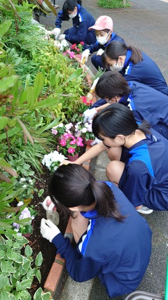 前日から雨模様で当日実施できるかどうか心配でしたが、朝方雨も上がり、42人の生徒がボランティアに参加してくれました。今回は、先月雑草取りをした花壇に、花の苗を植える活動でした。百日草やペンタスなど、花の特徴や苗の植え方などをNPO法人大田・花とみどりのまちづくりの方々に教えていただき、みんなで手分けして丁寧に植え、花にかからないよう注意しながらたっぷりの水をあげました。大岡山駅前に立ち寄る機会がありましたら、是非六中生も植えた可愛い花を楽しんでいただけたらと思います。