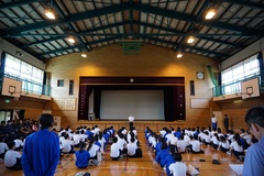 3・4時間目、体育館において気象予報士の依田司さんを講師に迎えて、地球温暖化防止授業を行いました。依田さんはテレビ朝日の朝のニュース番組「グッドモーニング」で天気予報を行うなど著名な方です。依田さんは区内の中学校出身で、現在大田区地球温暖化防止アンバサダーを務められ、毎年区内の小中学校それぞれ1校ずつ訪問されて講演活動を行っています。授業の冒頭ではテレビで拝見する語り口で2100年の夏の天気予報を紹介されました。全国津々浦々最高気温が40℃を超える予報に、深刻な未来を想像します。その後、様々なデータから、CO2の増加と気温の上昇はリンクして、かつ右肩上がりであること、気候変動に対する日本人の意識が諸外国と比べて低いことなどを知りました。そして、六中の活動を評価いただき、六中生への期待を込められました。また、各自の将来像や、気候変動に対する政策などについて、ランダムに指名され、受け答えする生徒に依田さんから温かい言葉をいただきました。