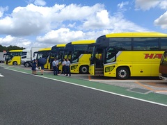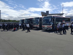 予定時刻の5分前には129名全員が集合し、出発式を行いました。天候は雨の予報と違い、明るい曇り空です。
