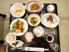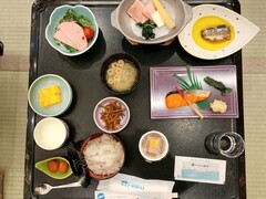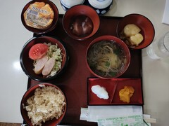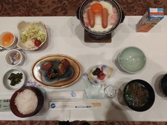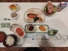 7時50分 朝食(国産米ひとめぼれ、味噌汁 とろろ昆布 みつ葉、香物、赤魚西京焼き、たらこ、ひじき、ポテトサラダ、目玉焼き、ウィンナー、ベーコン、海苔、納豆、枝豆わかめ中華、オレンジジュース、フルーツカクテル)