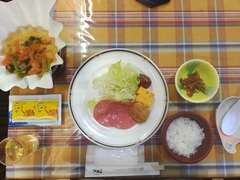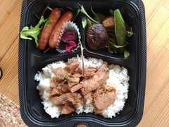 11時50分 ワタミオーガニックランドで昼食(南部どり味噌漬け、ごはん、生野菜 ベビーリーフ、加熱野菜 なす ピーマン パプリカ 椎茸、しば漬け)