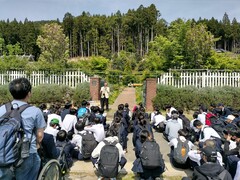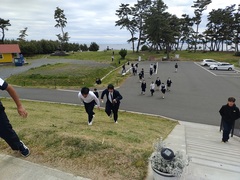 9:25雄勝ローズガーデンに到着しました。津波の被災の後に一本のバラを植えたことから始まり現在、英国式のローズガーデンにまで整備され復興の象徴となった庭を観賞した後、雄勝体育館で元雄勝小学校教員の徳水博志さんから震災に備えるお話しを六中の附近の状況をふまえていただきました。