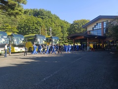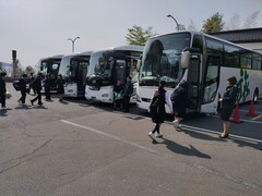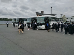 雨模様の中、各教室で出席確認を行い、8時15分から放送で出発式を行いました。その後、中原街道に停車しているバスに乗車し、先生方の見送りの中で8時45分にバスは発車しました。