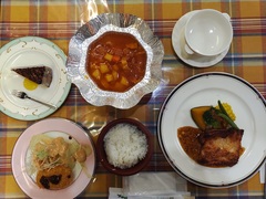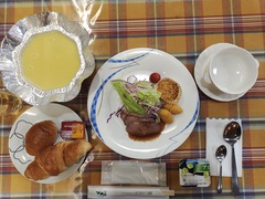 18時夕食 メニューは「牛ステーキ、サーモンカルパッチョ、シーザーサラダと揚げ物2種(エビ、タラ)、オニオンスープ、ご飯、紅茶シフォンケーキ」