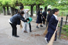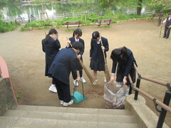 1100学級、2100学級、3100学級のボランティア生徒が早朝、洗足池公園を清掃しました。