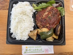 12:00東日本大震災津波伝承館の講演で地元の食材で作られたオーガニックのハンバーグ弁当を食べました。