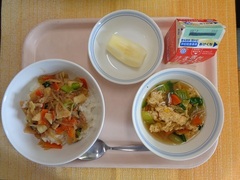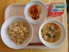 中華丼 牛乳 青菜と卵のスープ 果物(王林)
