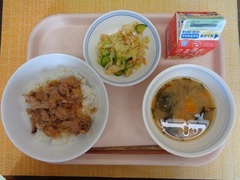 豚肉と玉ねぎの甘辛炒め丼 牛乳 野菜の甘酢和え わかめみそ汁
