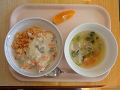 ケチャップライスのホワイトソースがけ 牛乳 野菜スープ 果物(愛まどんな)