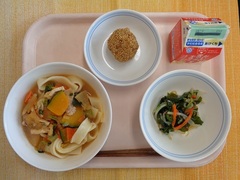 ほうとう 牛乳 わかめときゅうりの甘酢和え さつまいもごま団子