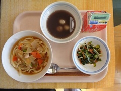 けんちんうどん 牛乳 わかめときゅうりの甘酢和え おしるこ