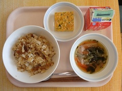 韓国風もやしごはん 牛乳 キムチ卵焼き わかめスープ