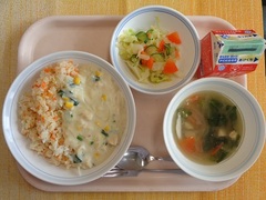 キャロットライスのクリームソースかけ 牛乳 フレンチサラダ 野菜スープ