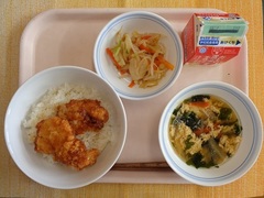 今日の給食は、3年生の入試が近づいてきているので、受験応援給食として、「試験に勝つ」という応援の意味を込め、縁起を担いでカツ丼を作りました。手洗い、うがい、マスクを徹底し、そしてバランスのよい食事を心がけしっかり体調を整えて、本番で力が発揮できるようにしてください。また、試験の前日には消化の良いものを食べて早めに寝て、体調を整えましょう。応援しています!