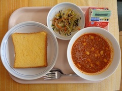 フレンチトースト 牛乳 チリコンカン ひじきのサラダ