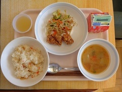 たけのこごはん 牛乳 鶏のから揚げ ごまじゃこサラダ 豚汁 りんごゼリー