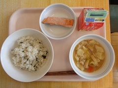わかめごはん 牛乳 鮭の塩焼き すいとん