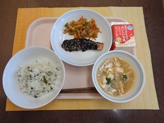 わかめごはん 牛乳 鮭の南部焼き じゃがいものきんぴら 小松菜のみそ汁