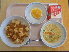 麻婆豆腐丼 牛乳 卵とコーンの中華スープ 美生柑