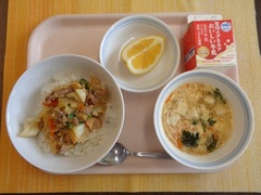 ホイコーロー丼 牛乳 サンラータンスープ 美生柑