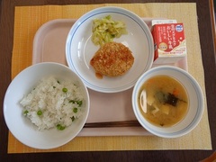 グリンピースごはん 牛乳 コロッケ キャベツソテー 豆腐のみそ汁