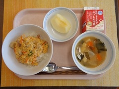 ベーコンピラフ 牛乳 魚のケチャップ和え ヌードルスープ