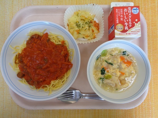 スパゲティピザ風ソース 牛乳 じゃがいものチーズ焼き 洋風卵スープ
