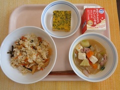 山菜ごはん 牛乳 卵焼き 豚汁
