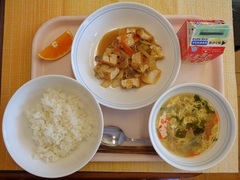 ごはん 牛乳 厚揚げと白菜のみそ炒め 卵とわかめのスープ 果物(オレンジ)