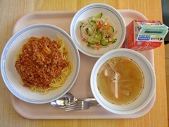 スパゲティミートソース 牛乳 チーズサラダ ジュリエンヌスープ